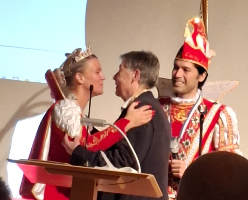 Die aufmerksam Zuhörenden im Gemeindesaal der freikirchlichen evangelischen Gemeinde erlebten noch eine Überraschung: Das Prinzenpaar mit Gefolge zog mit Karnevalsmarsch ein, ganz ungewohnt für diese Hallen, gratulierte der Verkehrswacht, lobte ihre Arbeit, stellte das gemeinsame Programm „Wer fährt trinkt nicht, wer trinkt fährt nicht“ vor, führte ein Tänzchen auf und verteilte Karnevalsorden. Alle Gäste freuten sich im Rhythmus über diese nicht erwartete, bunt-laut-fröhliche Einlage.