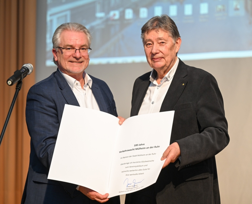 Gratuliert haben viele bei der 100 Jahr-Feier, fast 100 Gäste im Casinohaus an der Delle. Aus Düsseldorf kam der NRW-Verkehrsminister Oliver Krischer, aus Berlin die Präsidentin der Deutschen Verkehrswacht Kerstin Lühmann, der Oberbürgermeister Marc Buchholz hatte es nur über die Straße und Helge Schneider war mit einem Video präsent. Alle mit Grußworten, jeder auf seine Art.