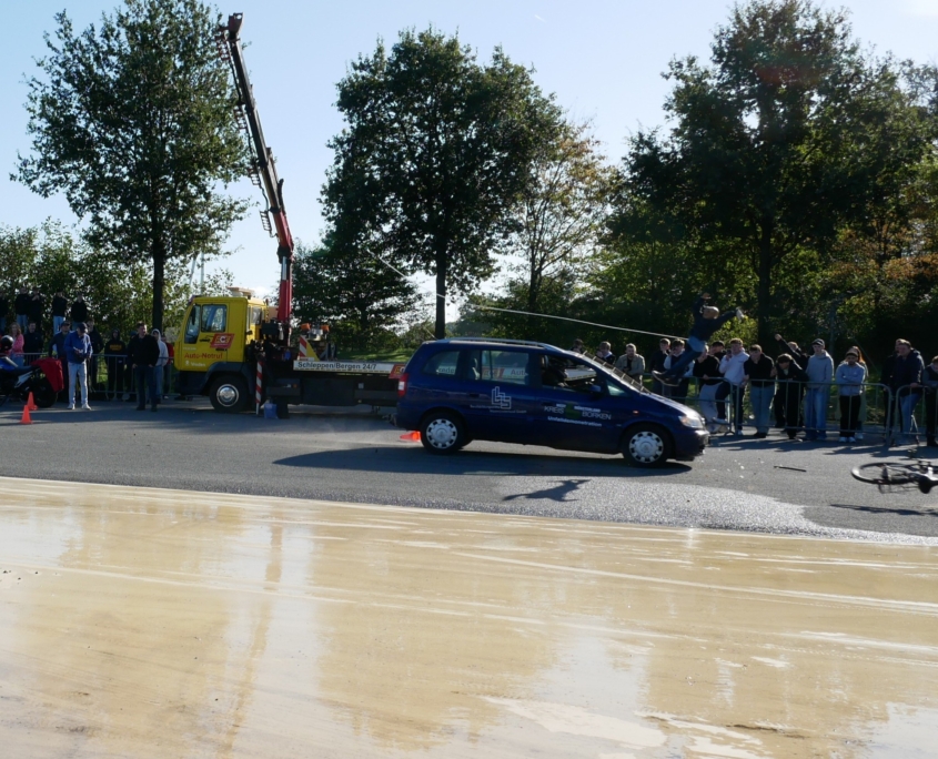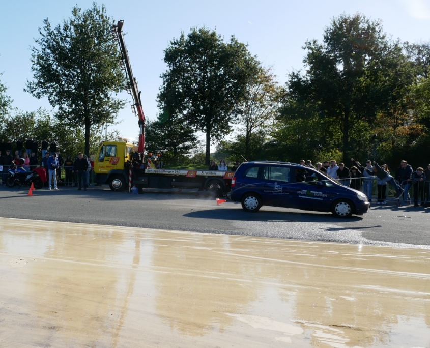 Gespannt sind sie darauf, dass gleich Autos zu Schrott gefahren werden, oder auf glatter Fahrbahn oder trockenem Asphalt bei niedrigen oder höheren Geschwindigkeiten schleudern, in Hindernisse crashen oder ihnen geschickt ausweichen oder davor zum Halten kommen.